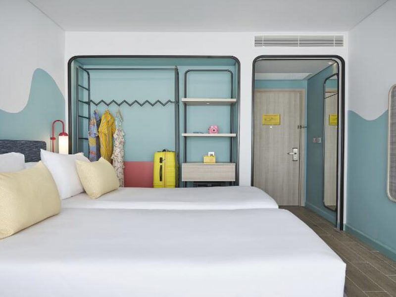 Khách sạn mang phong cách thiết kế hiện đại, năng động với những gam màu tươi sáng. Không gian phòng nghỉ được decor theo tone pastel và xanh biển, tạo cảm giác dễ chịu và cực kỳ photogenic.