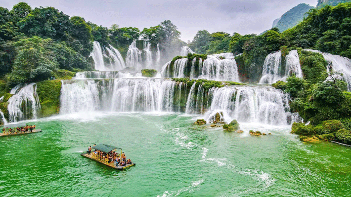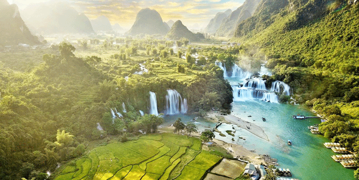 + Thác Bản Giốc - một trong những thác nước đẹp nhất của Việt Nam có đường ranh giới tự nhiên với Trung Quốc. Thác nước đẹp và hùng vỹ với dòng nước cuồn cuộn chảy quanh năm bắt nguồn từ dòng sông Quây Sơn nước xanh ngắt một màu ngọc Bích. Đẹp nhất vào mùa lúa chín (tháng 9) khung cảnh đường vào thác sáng rực một màu vàng óng và dòng nước trắng xóa mềm mại như tóc tiên càng làm khung cảnh thêm nên thơ, hùng vỹ.